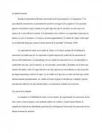 Resalta la importancia del trato emocional como la persistencia y el entusiasmo. Y la necesidad de concentrarse en pensamientos positivos en lugar de los negativos “Las personas parecen concentrarse mejor cuando se les pide algo más que lo corriente, en cuyo caso son capaces de ir más allá de lo normal. Si la demanda es muy inferior a su capacidad, la persona se aburre y si, por el contrario, es excesiva, termina angustiándose. El estado de «flujo» tiene lugar en esa delicada franja que separa el aburrimiento de la ansiedad” (Goleman, 2016)