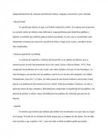 La denominación está también gravemente comprometida. Los neologismos y parafasias son de tipo semántico. La lectura en voz alta está muy afectada, pero el paciente puede entender bastante bien los textos y las órdenes escritas. La escritura está repleta de paragrafias.