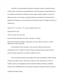 Contribuye a las transformaciones políticas, económicas, sociales y culturales para que las niñas, niños y adolescentes ejerzan plenamente sus derechos humanos, impulsando procesos de coordinación, articulación e incidencia en marcos legales, políticas públicas y acciones de defensoría social a nivel nacional y municipal, teniendo como referencia la Constitución de la República de Nicaragua, la Convención sobre los Derechos del Niño y el Código de la Niñez y la Adolescencia.