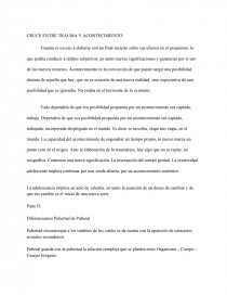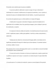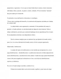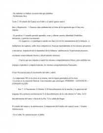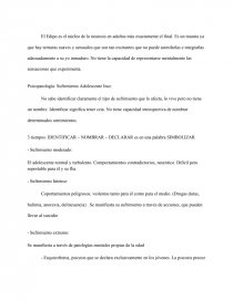 La adolescencia como duelo de la infancia. Adolescente no enlutado → pierde su infancia pero no está abrumado por la pena de la pérdida; la tristeza no lo invade. Puede percibir la pérdida de los padres de su infancia, la ausencia del universo familiar o de los sueños de cuando era niño. Pero al mismo tiempo (acá está lo renaciente y creativo) asume los cambios, su cuerpo nuevo y las nuevas exigencias afectivas, cognitivas y sociales.