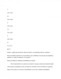 En la actividad dos obtuvimos como medición directa del cable que hay 2,5 ohm de resistencia al pasar la corriente por la bombilla, pero al realizar operaciones con los datos tabulados obtenidos previamente de mediciones con el voltímetro, el amperaje no aumenta de forma tal que el cociente con el voltaje respectivo nos de la resistencia medida directamente, otorgando resistencias desde 3,4 hasta 5 ohm, esto puede ser debido por no medir directamente la resistencia en todos los voltajes posibles, lo que podría dar un aumento en el rango de los valores de las resistencias, en este caso se podría suponer que los distintos valores de resistencia son consecuencia simplemente por fenómenos físicos que alteran el comportamiento de la corriente por un conductor, como lo es el aumento de la temperatura que aumenta la energía cinética de los átomos del metal de esta manera dificultando el paso de los electrones aumentando su resistencia, o los resultados pueden ser producto de errores durante la medición del amperaje.