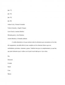 - La tabla alimenticia es la que contiene todos los alimentos que consumimos en los días del campamento, esta tabla debe de estar completa con los alimentos básicos que son: carbohidratos, proteínas, vitaminas y grasas. También tiene que ser complementaria, ya que hay que poner alimentos que te vallan a servir para la actividad que se vaya a hace.