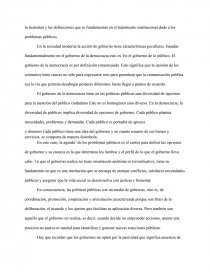 La institucionalidad" denota no sólo la forma del gobierno moderno, sino la capacidad que tiene para que los espacios público y privado sean objeto de reglas que permiten la convivencia articulada, cooperativa y positiva de los distintos grupos sociales. En el gobierno moderno. la institucionalidad es requisito para alcanzar resultados satisfactorios. Sin la misma se dificulta que los conflictos, las tensiones y los desaciertos sean absorbidos con eficacia.